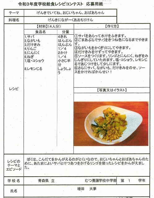 青森県教育委員会が主催する「令和3年度学校給食レシピコンテスト」で、中学部1年の増田大夢君の考案したレシピ「げんきにながーくあおもりけん」が、多数の応募レシピの中から、特別支援学校の部において最高賞となる最優秀賞をいただきました!!