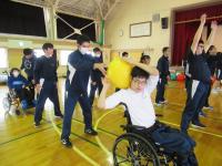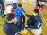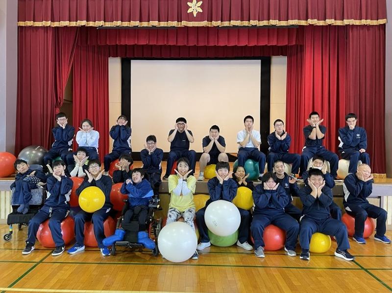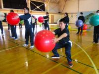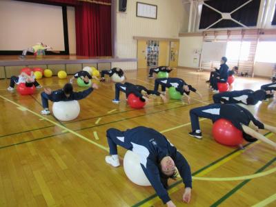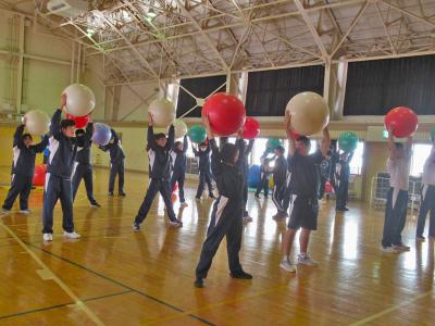 生徒たちは自分に合った大きさのバランスボールを一人一個使用しながら、音楽やリズムに合わせて様々な体操や身体の動きに挑戦していました。