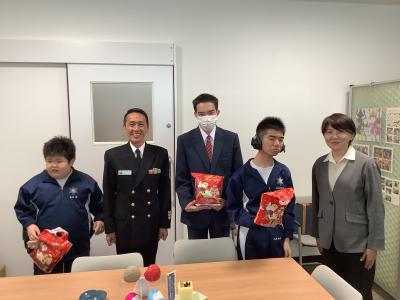 小学部、中学部、高等部の代表児童生徒がプレゼントを受け取り、写真撮影をしました。海曹会様、ありがとうございます!