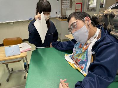校長先生も作りたくなったようです。生徒が校長先生に作り方を教えています。